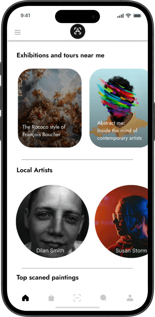 With these insights, I designed Artastic, an art gallery companion app that enhances your museum visit. Artastic allows you to scan and identify artwork, providing instant access to detailed information and artist insights. You can explore nearby exhibitions and local artists, and connect to the museum's gift shop for exclusive merchandise. The app offers an immersive, user-friendly experience, making your art exploration seamless and engaging.